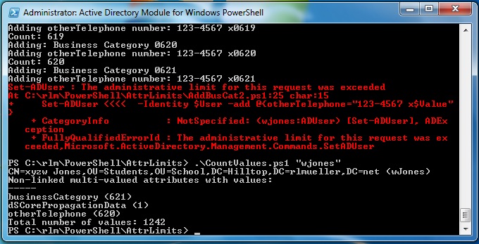 The image below shows the error message raised when an attempt was made to add another value to the otherTelephone attribute of a user (User 6 in the second table below). Then the CountValues.ps1 script was run to document that this user has 1,242 values in all non-linked multi-valued attributes combined.