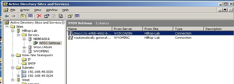 Connection objects and their properties can be viewed in the Active Directory Sites and Services MMC. The following image shows two intra-site connection objects in the NTDS Settings object for domain controller Nebraska.