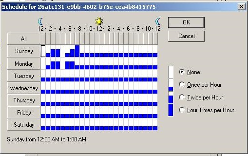 Notice that the GUI shows how many times per hour replication is scheduled. As will be seen later, there is actually more to the schedule than is shown here. The schedule is displayed in local time. The first replication on Sunday in the image above is scheduled during the 1:00 am hour local time. No replication is scheduled during the first hour, from 12:00 to 12:59 am.