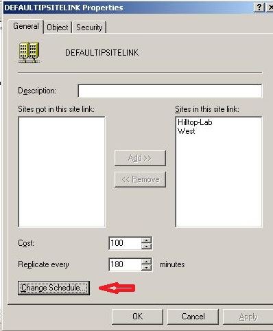 Click "Change Schedule" to view and update the replication schedule of this inter-site connection object.