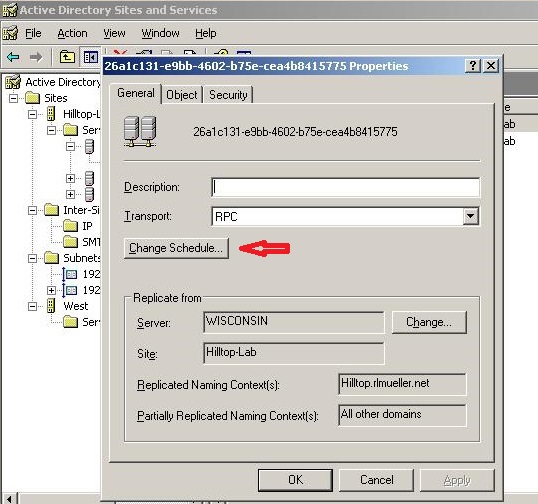 Click "Change Schedule" to view and update the replication schedule of this intra-site connection object.